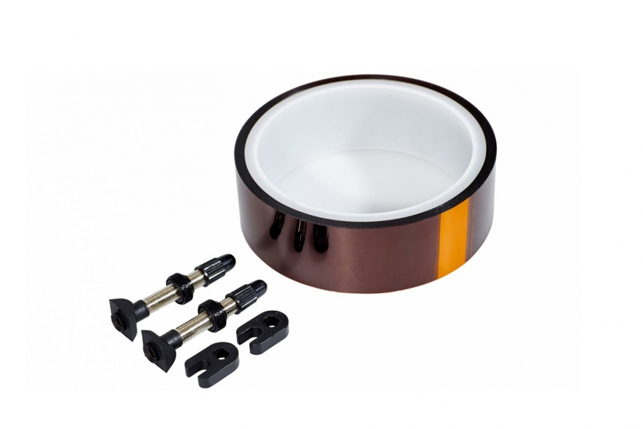 Комплект состоит из ободной ленты, двух ниппелей Presta и двух съемников сердечника.