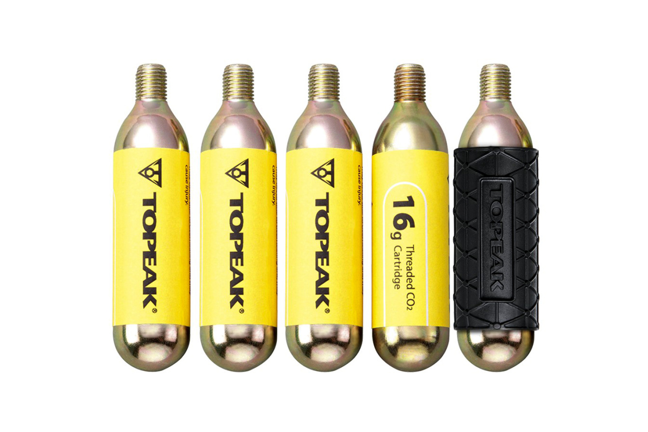 Картриджи для насоса Topeak 16G Threaded CO2 Cartridge в комплекте из 5 штук с весом CO2 16 грамм, с прочным силиконовым рукавом для защиты рук во время накачивания. Созданы для быстрого и качественного накачивания велосипедных колес до нужного давления в шинах.