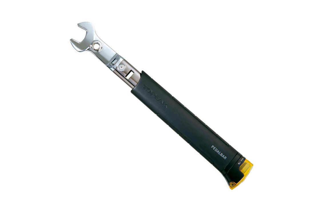 Профессиональный педальный ключ Topeak Pedal Bar, 15 мм, с телескопической рукояткой для мощного рычага и набором шестигранных бит 6 и 8 мм для ремонта и настройки велосипеда. Угловой дизайн предохраняет кисть от контакта с цепью.