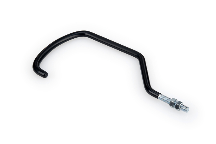 Стальной крючок крепится в отверстие балки или потолка с помощью резьбы и гаек. Виниловое покрытие предотвращает царапины от контакта обода колеса с металлом крючка.