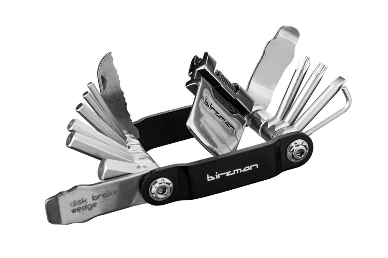 Набор включает 7 шестигранных ключей, ключ Torx, крестовую и шлицевую отвертки, выжимку цепи на 9-12 скоростей, 4 спицевых ключа, монтажки, инструмент для правки тормозного диска, инструмент для ниппелей Presta, нож и открывашку.