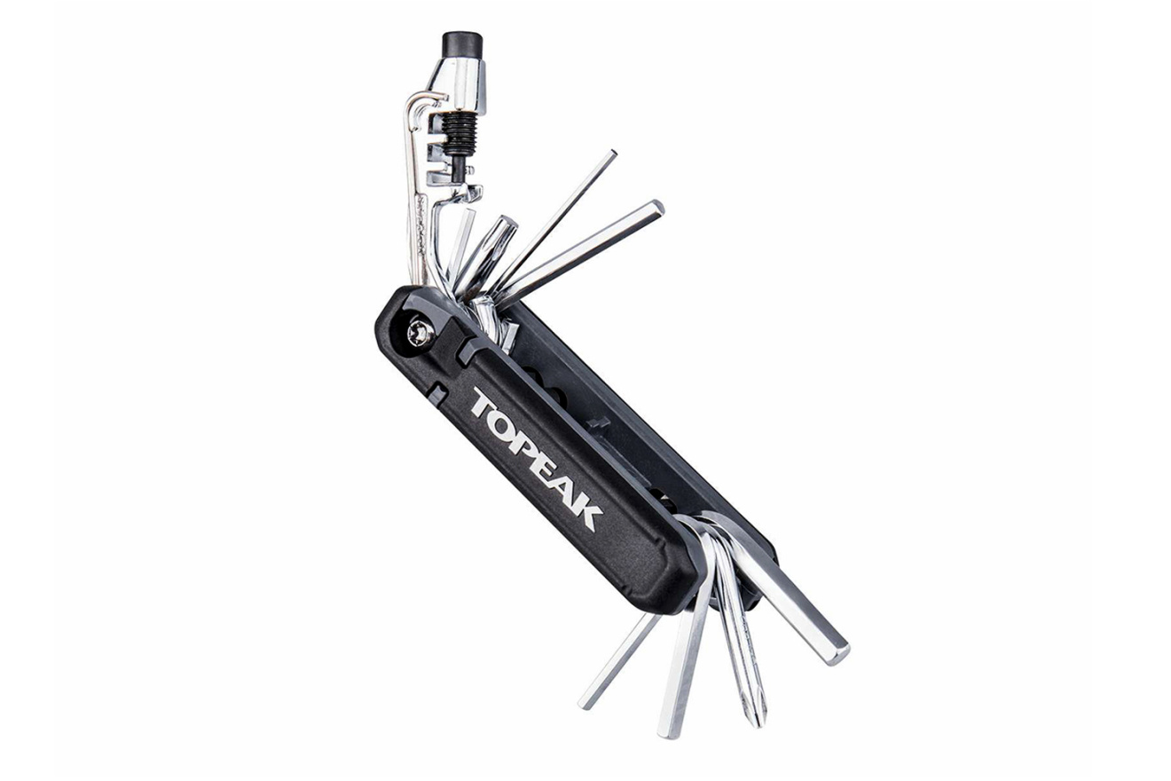Включает самозажимной инструмент (наконечник T25 Torx®), инструмент Presta Core Tool для затяжки или снятия двухкомпонентных клапанов Presta, инструмент для цепи с выжимкой*, отвертки Phillips, спицевые ключи, стальной цепной крюк.
