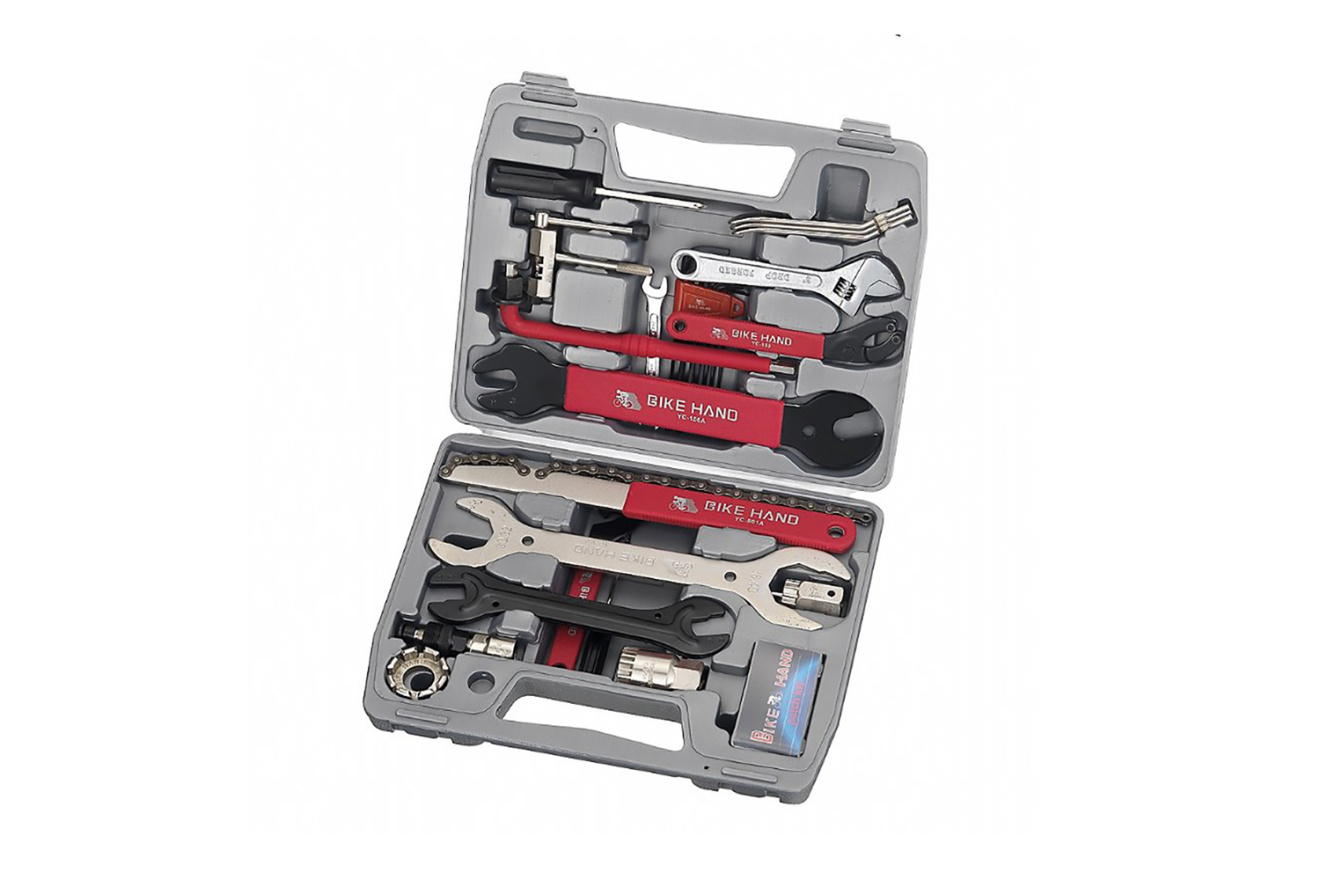 В комплекте шлицевая/крестовая отвертка, монтажки, выжимка цепи, разводной ключ, шестигранные ключи 2 / 2.5 / 3 / 4 / 5 / 6 мм, гаечные ключи 8 / 10 мм, съемник стопорных колец, шестигранный ключ 8 мм, педальный ключ, хлыст для кассет 7-11 скоростей, съемник кассеты, шлицевая отвертка 3 мм, ключ для рулевой колонки 30 / 32 / 36 / 40 мм, съемник стопорных колец с пином, ключи конусные 13 / 14 / 15 / 16 мм, съемник каретки для Shimano, ремкомплект, съемник шатунов, спицевой ключ.