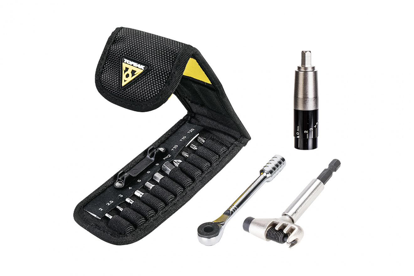 Набор включает TorqBit с усилием 2-6 Нм, шестигранные биты 2 / 2.5 / 3 / 4 / 5 / 6 / 8 мм, биты Torx T10 / T15 / T25, крестовую отвертку #2, выжимку цепи для односкоростных и многоскоростных цепей (до 12 скоростей, не включая цепи с полыми штифтами Campagnolo).