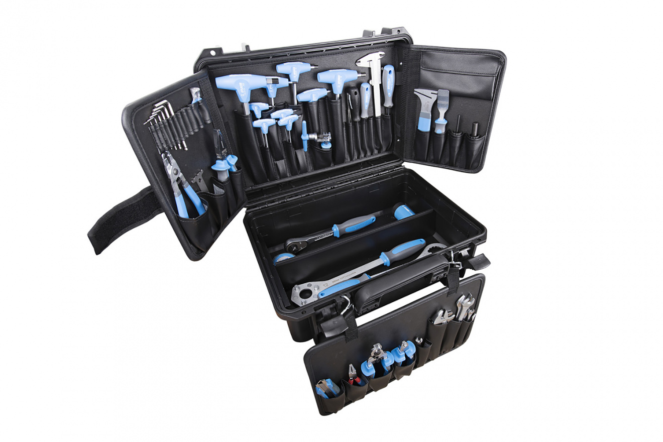 В комплекте пять гаечных ключей 6 х 7 / 8 x 9 / 10 х 11 / 13 х 15 / 17 х 19 мм, накидной гаечный ключ 8 х10 мм, рукоятка 1/2”, шестигранник T-образный 2 / 2.5 / 3 / 4 / 5 / 6 / 8 / 10 мм, шестигранник T-образный Torx T10 / T25, шестигранник Г-образный 1.5 / 2 / 2.5 / 3 мм, шестигранник Г-образный с круглым наконечником 4 / 5 мм, разводной ключ, штангенциркуль, плоскогубцы комбинированные, кусачки, съемник внутренних стопорных колец, кусачки для тросов и рубашек, универсальный нож, отвертка крестовая Ph1, отвертка шлицевая 3 / 5.5 мм, шило с круглым наконечником, рулетка 3 м, напильник, молоток, пинцет, съемник каретки 16 шлицов, индикатор износа цепи, инструмент для правки ротора, ключ для кассеты, выжимка цепи, съемники кассет со штифтами 5 / 12 мм, клещи для замка цепи, инструмент для развода поршней дискового тормоза.