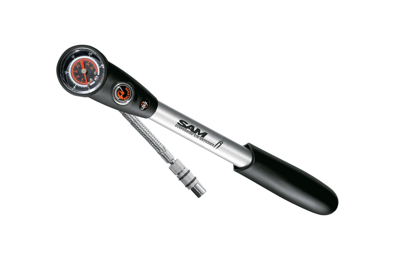 Насос SKS SAM для поддержания и регулировки давления в вилке и заднем амортизаторе MTB велосипеда. Шланг в стальной оплётке выдерживает давление до 315 psi, а его двухступенчатый вентиль предотвращает потери давления во время отсоединения от штуцера.
