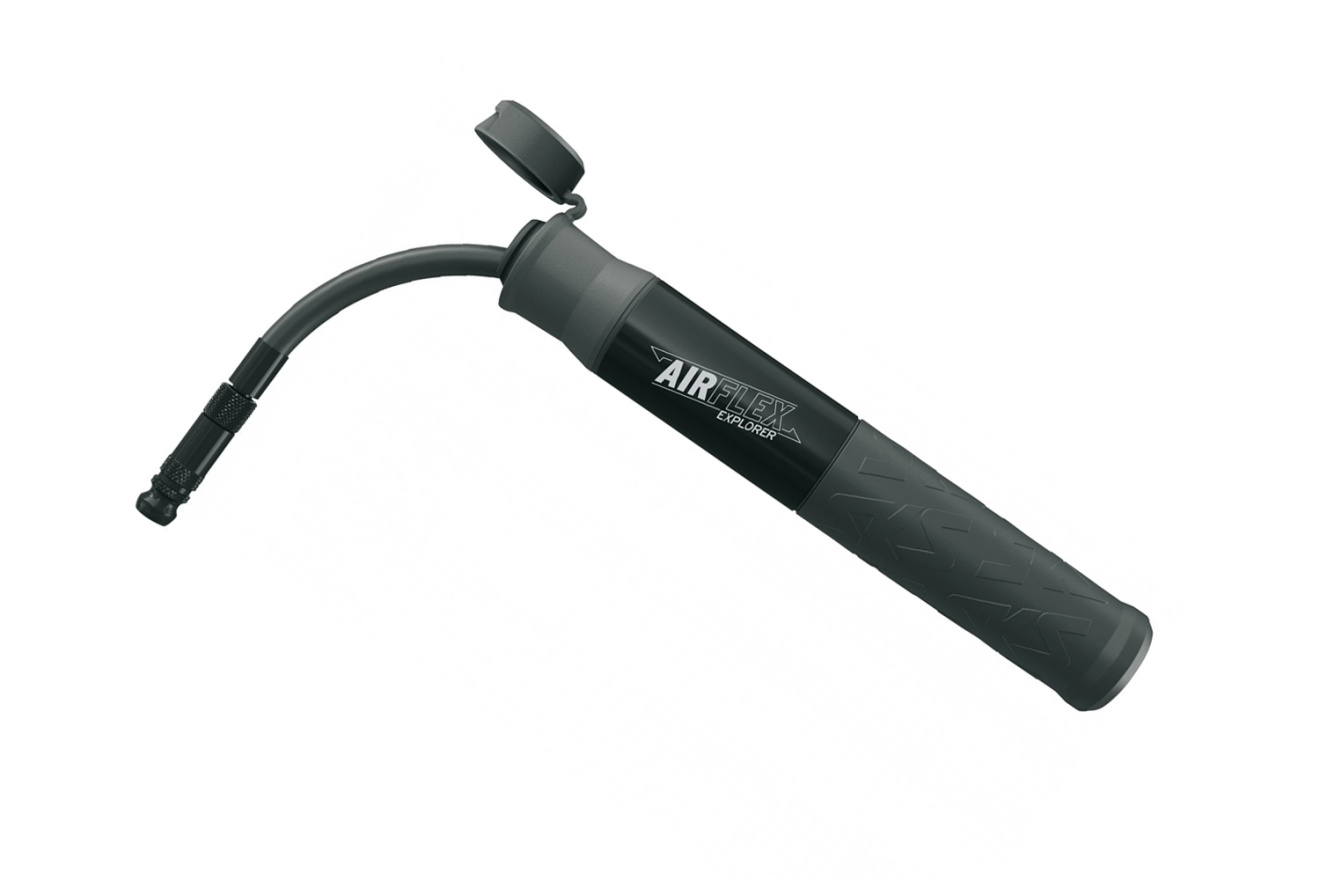 Насос велосипедный SKS Airflex Explorer, ручной оснащен шлангом, хранящимся в трубке, закрыт пылезащитным колпачком.
