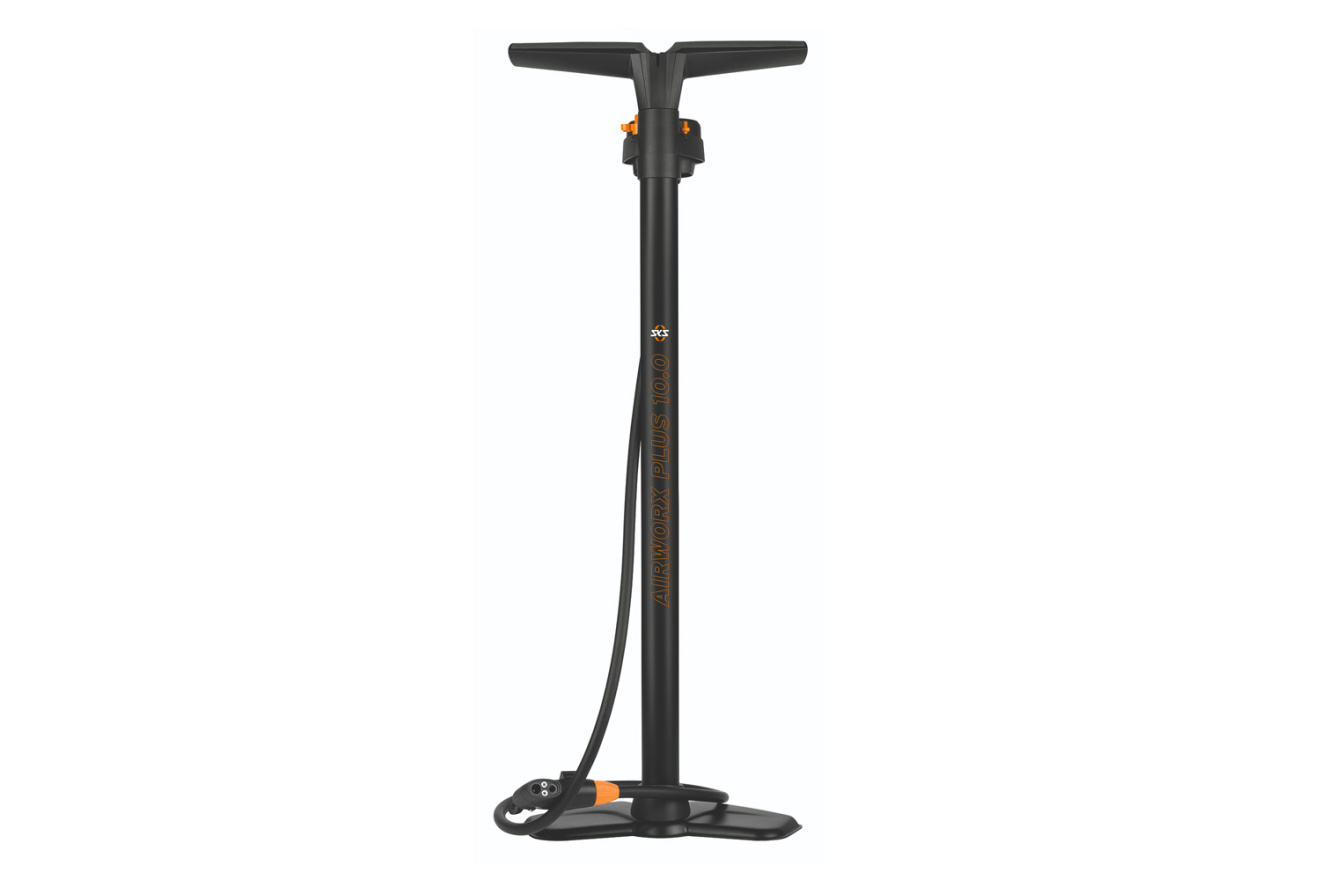 Универсальный напольный велосипедный насос SKS Airworx 10.0 Plus профессионального уровня со стрелочным манометром и головкой под любые типы ниппелей, обеспечивает максимальное давление 10 бар (144 psi).
