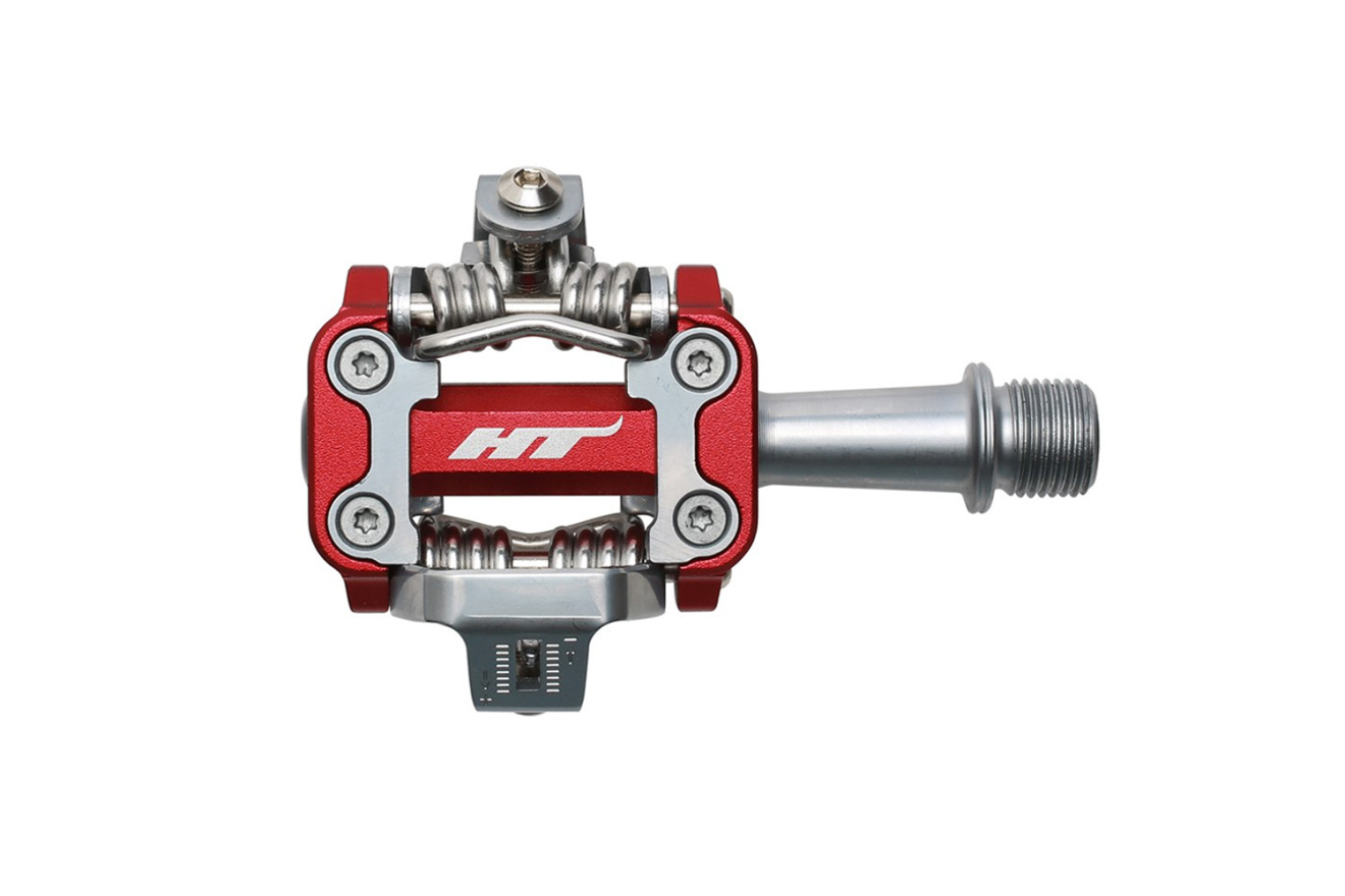 Контактные педали HT M1 стандарта HT Pro Cleat с алюминиевым корпусом, стальной осью и двусторонним механизмом встегивания.
