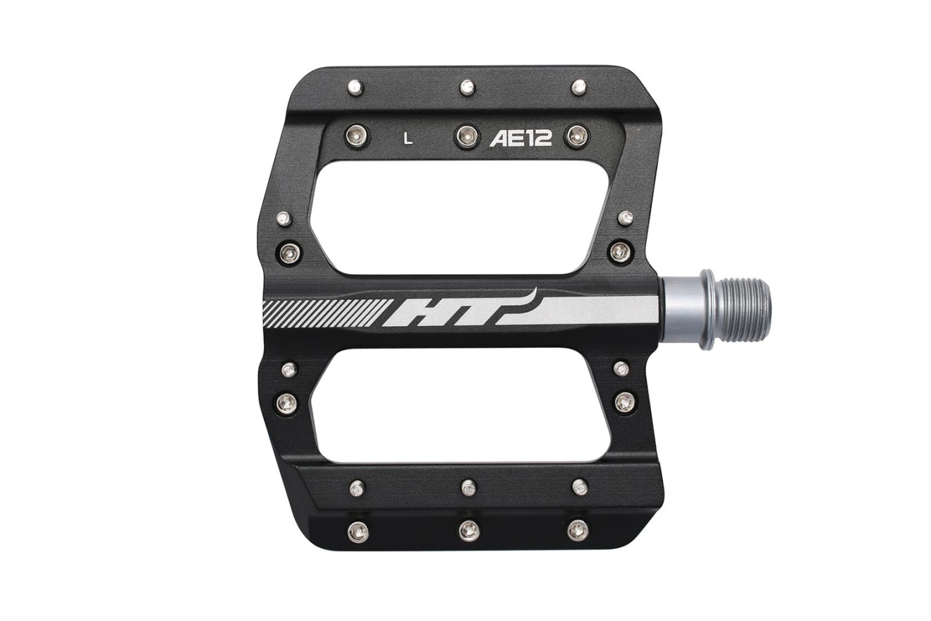 Педали платформы HT AE12 с алюминиевым корпусом, стальной осью и 10 сменными шипами для горных велосипедов. Рассчитаны на узкую ногу.