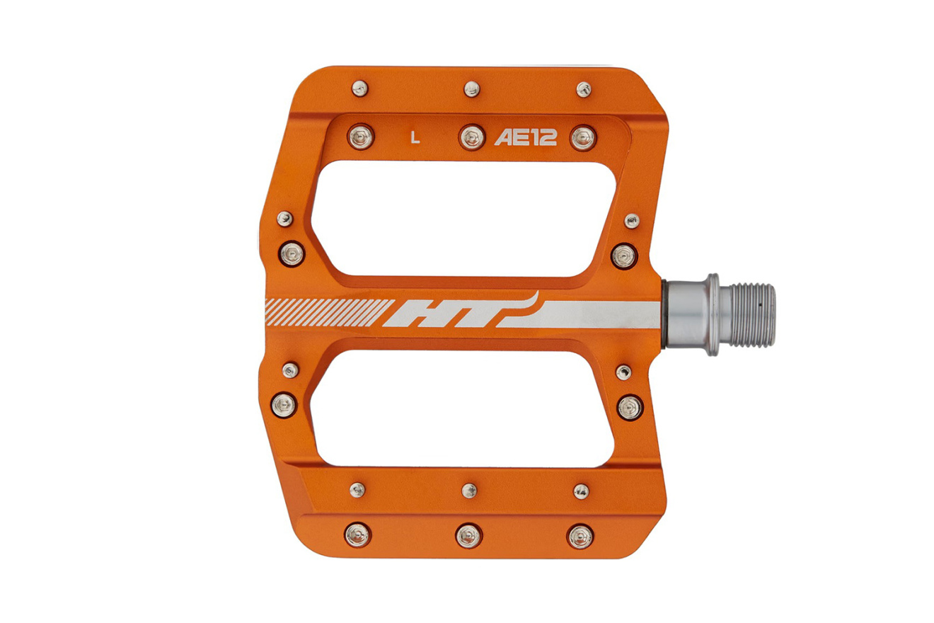 Педали платформы HT AE12 с алюминиевым корпусом, стальной осью и 10 сменными шипами для горных велосипедов. Рассчитаны на узкую ногу.
