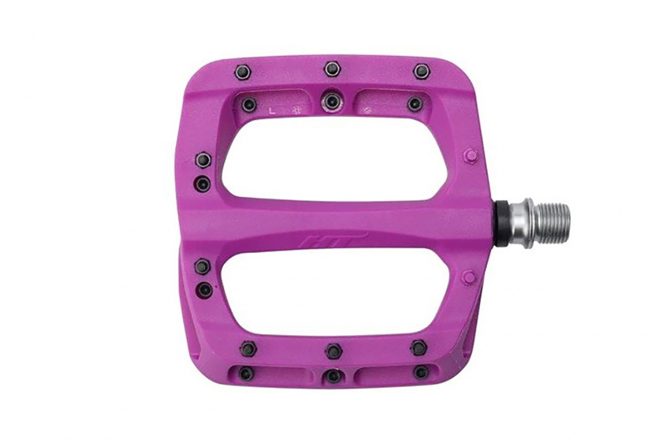 Педали платформы HT PA03A с пластиковым корпусом, стальной осью и 16 сменными шипами для горных велосипедов. Одни из лучших в бюджетном ценовом сегменте педалей.