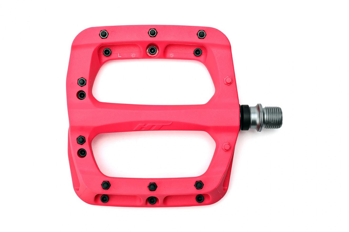 Педали платформы HT PA03A с пластиковым корпусом, стальной осью и 16 сменными шипами для горных велосипедов. Одни из лучших в бюджетном ценовом сегменте педалей.