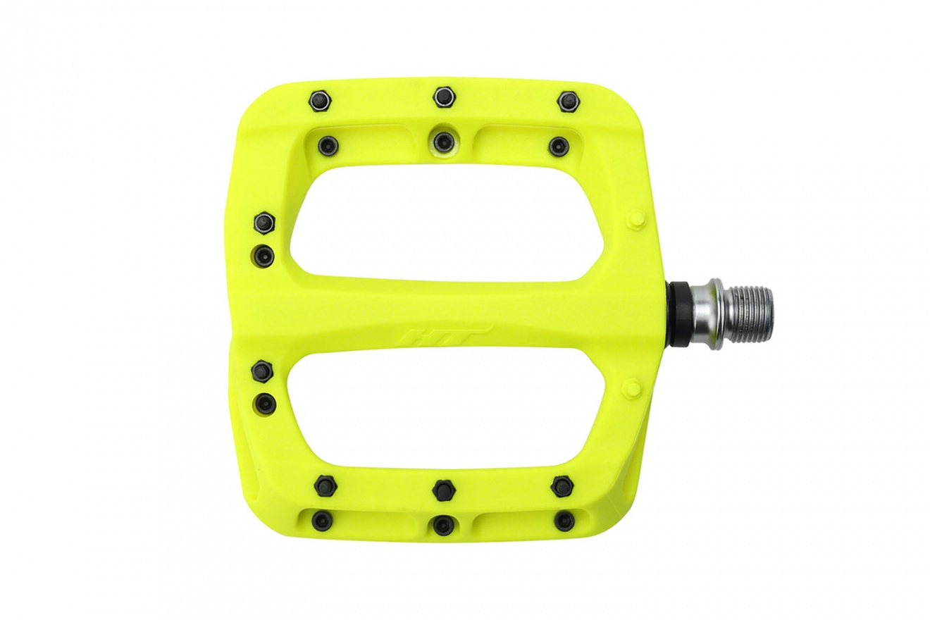 Педали платформы HT PA03A с пластиковым корпусом, стальной осью и 16 сменными шипами для горных велосипедов. Одни из лучших в бюджетном ценовом сегменте педалей.