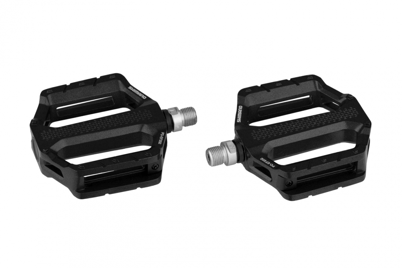 Педали платформы Shimano PD-EF202 выполнены из алюминия и оснащены специальными углублениями, снижающими вес и обеспечивающими лучшую устойчивость к грязи.
