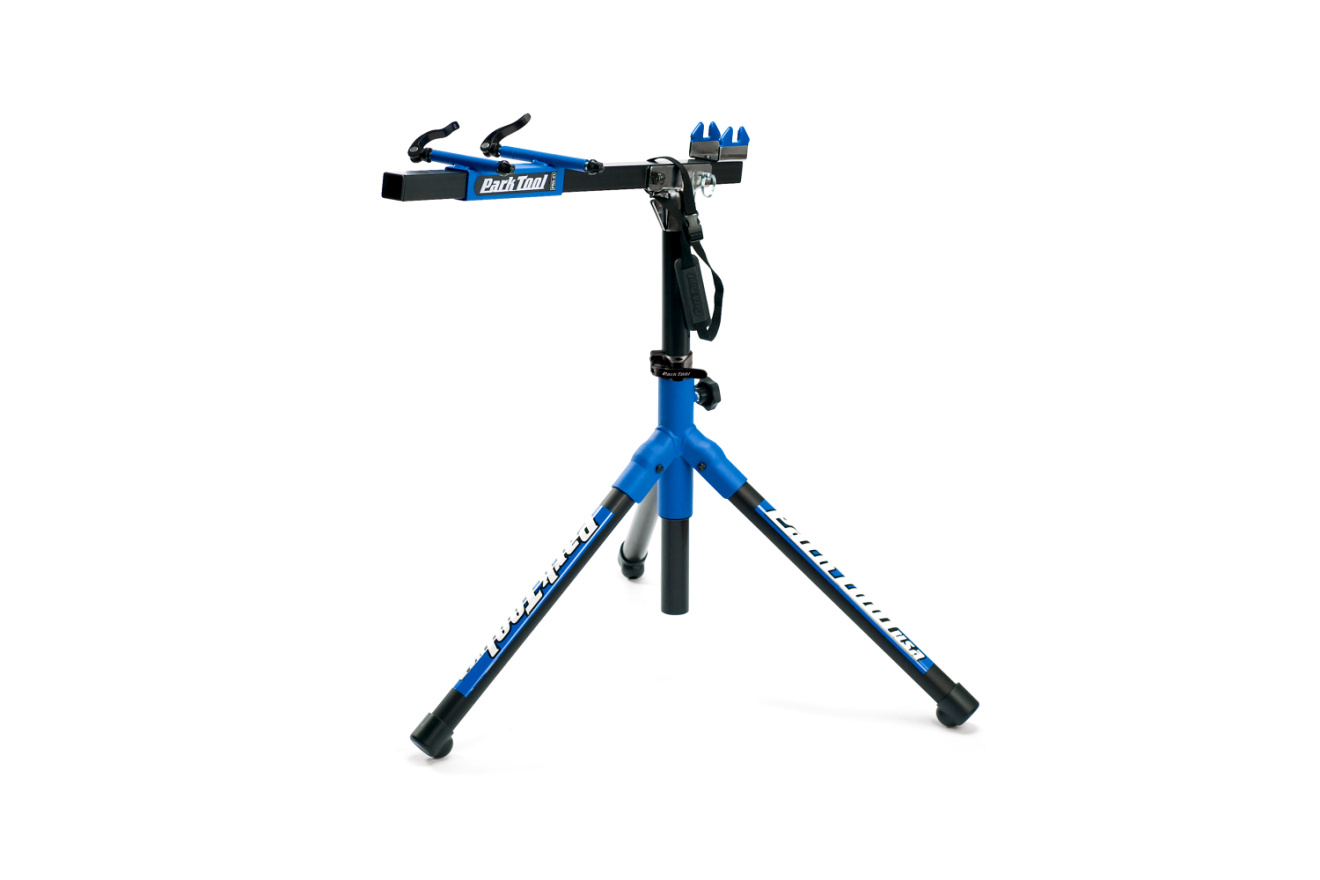 Облегчённый ремонтный стенд Park Tool Super Lite Team Race Stand с креплением велосипеда за каретку и дропауты. Применяется для выездного ремонта и настройки шоссейных велосипедов со сверхлёгкими карбоновыми рамами в условиях соревнований или мероприятий.