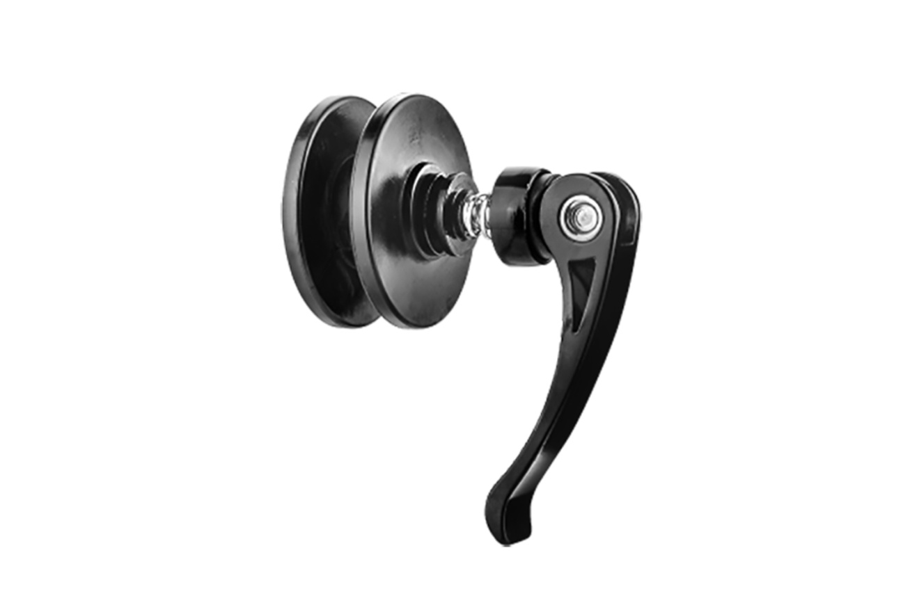 Благодаря быстроразъемному рычагу инструмент быстро фиксируется на дропауте, а свободно вращающееся колесо позволяет без лишних разместить цепь.