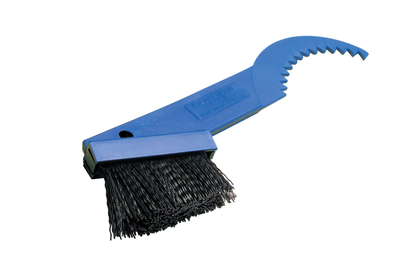 Большая удобная ручка с изогнутым зубчатым конецом достаёт грязь глубоко между шестернями. Прочная нейлоновая щетина хорошо чистит переключатель и цепь.