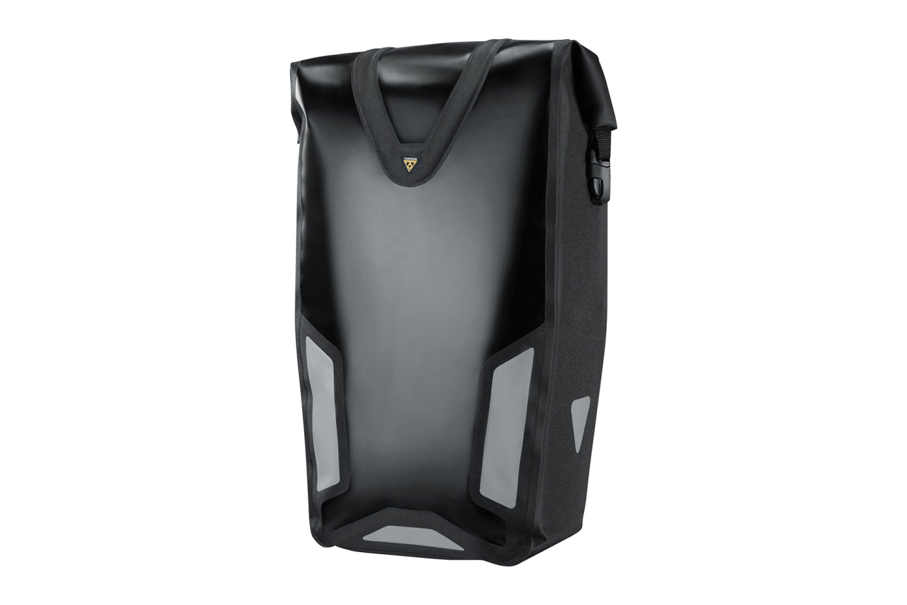 Конструкция закрывается сверху путём скручивания. Крепление крюком и защёлкой QuickClick сбоку на раму багажника. Светоотражающие принты для безопасности в темноте.