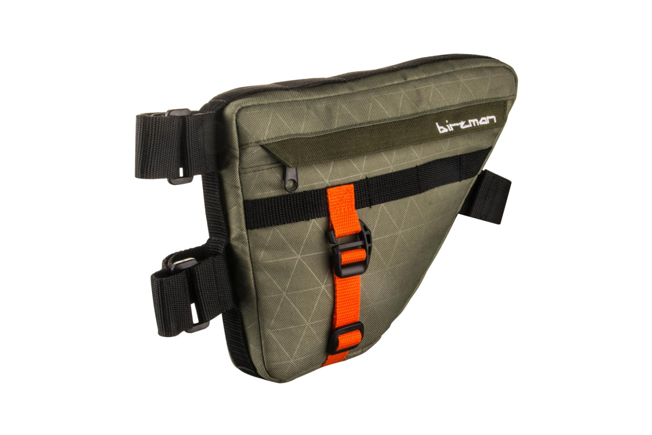 Велосумка Birzman Packman Travel Frame Pack Satellite для размещения в переднем треугольнике рамы, выполненная из высокоплотной водоотталкивающей ткани и снабженная застежкой-молнией с защитным клапаном. Входит в модульную коллекцию сумок для байкпакинга Birzman Packman Frame Pack. Составляет комплект с сумкой Birzman Packman Travel Frame Pack Planet, но также будет полезна и как самостоятельный предмет экипировки для велопутешествий. Вместительна, имеет достаточный для перевозки необходимых в длительных поездках вещей объем в 2.5 л. Ремешки с застежками на липучке позволяют закреплять сумку разными способами на рамах с различной геометрией.