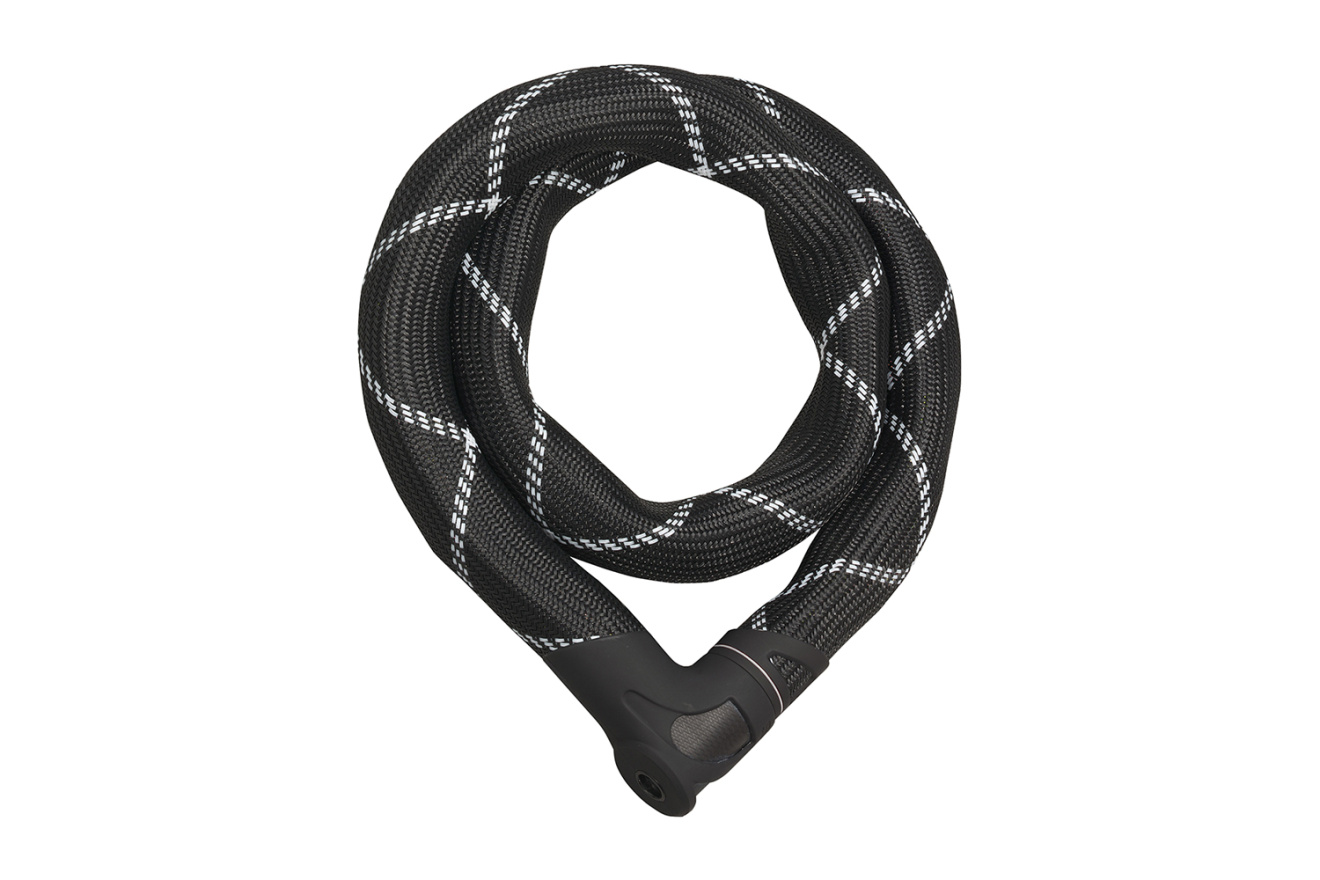 Цилиндрический замок с 2-мя ключами и уровнем стойкости 10 подходит при риске кражи средней степени. Цепь закрыта подвижным сетчатым рукавом для защиты лакокрасочного покрытия велосипеда.